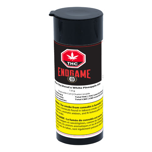 Enjoy Endgame Blue City Diesel x White Pineapple AIO. High in THC and packed with tasty terpenes, this potent blend of distillate and botanical terpenes hits you with fresh pineapple, juicy melon, and hints of blueberry.