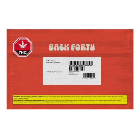 • Turn up the heat with Back Forty's legendary cultivar - Fire Breath. A cross between Fire OG and Mendo Breath, this potent indica produces dense buds loaded with trichomes, offering pungent notes of fresh earth, woody spice, and a hint of diesel. Back Forty flower is always hang-dried, gently machine-trimmed, and hand-finished. Minimum 14-day cold cure. Sealed with humidity pack.