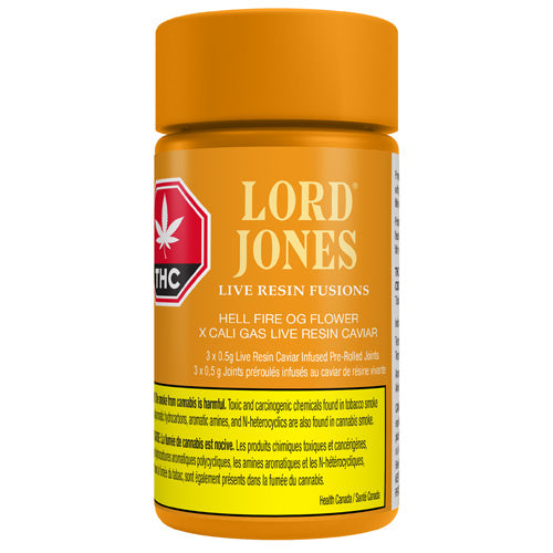 Lord Jones Live Resin Fusions are kief-coated and filled with high-potency, terpene-rich, live resin caviar and hard-hitting, single-strain flower sure to go beyond all expectations. With the Lord Jones Live Resin Fusions Hell Fire OG x Cali Gas, take yourself to the underworld of potency and flavour with a fusion of gassy and garlicy Cali Gas live resin caviar and Hell Fire OG flower. Finish strong with a dense pine aroma that fills the room with every exhale. With the addition of premium ceramic filters, your smoking experience is now smoother than ever.