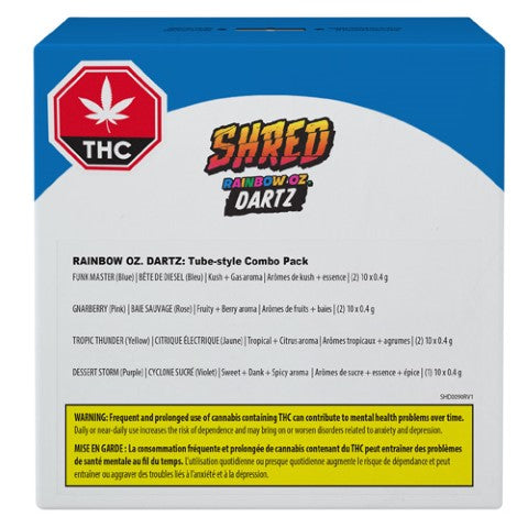 • Blaze the Rainbow, with SHRED Dartz Rainbow Oz.! This bulk pre-roll mixer pack contains seven (7) 10x0.4g packs of their most popular SHRED blends, expertly rolled in 100% organic hemp paper, for an incredibly smooth and flavourful sesh. The whole gang is in this one pack, and then some! Two (2) packs each of Tropic Thunder, Gnarberry, and Funk Master – and one (1) pack of Flower Power for good measure. Try all of the best-selling SHRED blends in one convenient Rainbow Oz. of Dartz!